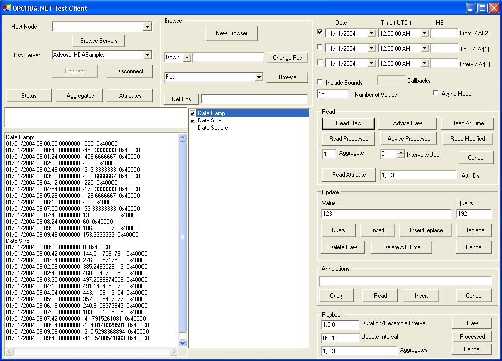 可以交互调用所有 OPC HDA 1.2 函数以检查值是否按预期返回。 这可能有助于确定是否必须在正在开发的客户端或其他地方搜索意外行为。